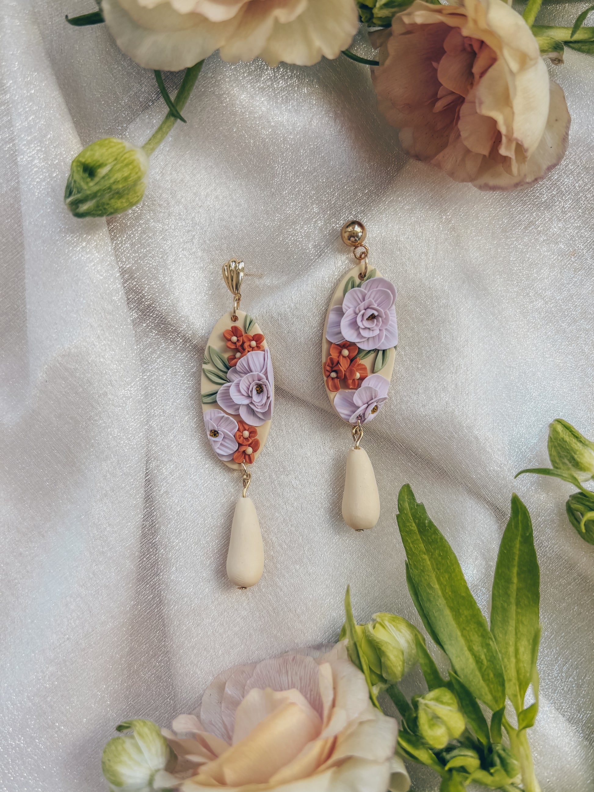 Each detail handcrafted for a stunning lightweight polymer clay pair of earrings. This stunning spring bloom inspired pair of earrings feature a delicate lilac flower design with a handmade bead. These earrings are slow made in small batches just for you.