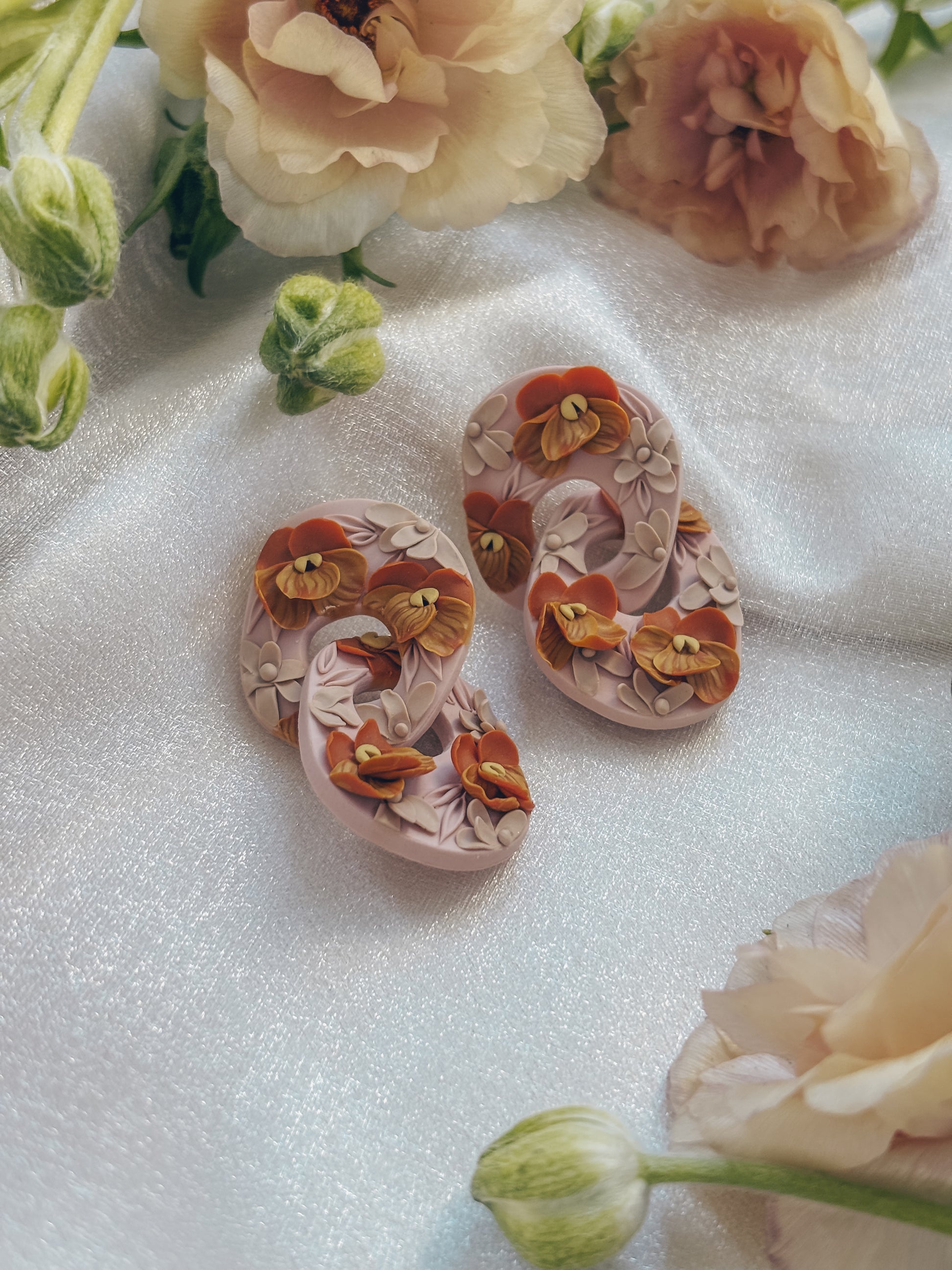Each detail handcrafted for a stunning lightweight polymer clay pair of earrings. This stunning spring bloom inspired pair of earrings feature an orange Pansy cane floral dangle design with soft accent blooms. These earrings are slow made in small batches just for you.